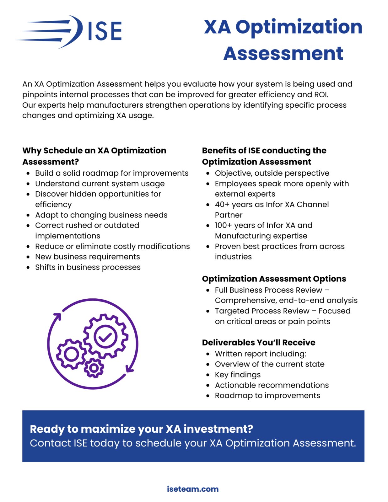 Unlock the full potential of your Infor XA system with ISE’s XA Optimization Assessment, a comprehensive review designed to help manufacturers improve efficiency, reduce costs, and increase ROI. This expert-led assessment identifies process bottlenecks, system inefficiencies, and hidden opportunities for optimization across your entire organization. By evaluating business processes, IT strategy, and system usage, ISE provides manufacturers with a clear, data-driven roadmap for continuous improvement and long-term growth. Whether you’re dealing with outdated implementations, adapting to new business requirements, or simply looking to get more from your XA investment, this resource shows how optimization can deliver measurable results.